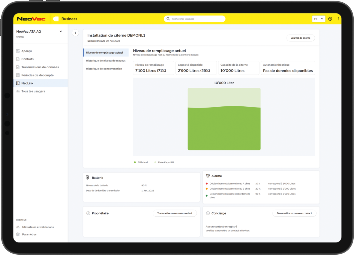 Vous trouverez à tout moment vos données sur notre portail en ligne « NeoVac Business ». Cette solution vous permet de voir immédiatement le niveau de remplissage de toutes les citernes activées. Vous visualisez les capacités disponibles et les niveaux minimaux dépassés sont indiqués en rouge. « NeoVac Business » vous aide à optimiser votre achat de mazout et prend en charge les exportations au format CSV. Il donne aussi un aperçu de la consommation de chaque citerne.