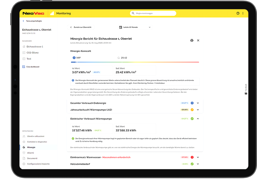 Una caratteristica di particolare valore: l’impronta di CO2 dei suoi immobili viene calcolata direttamente nell’app. Inoltre, in veste di partner Minergie, NeoVac garantisce un monitoraggio dell’energia certificato secondo lo standard Minergie e consente lo scambio continuo dei dati secondo i requisiti di Minergie.