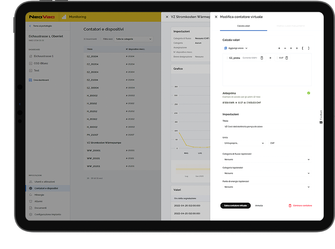 Con il software «NeoVac Monitoring Pro» può monitorare costantemente il consumo energetico di interi edifici e aree – l’ideale per chi gestisce gli immobili e per chi si occupa professionalmente di Facility Management! Contatori virtuali personalizzati e allarmi flessibili le garantiscono di avere sempre il controllo completo.
