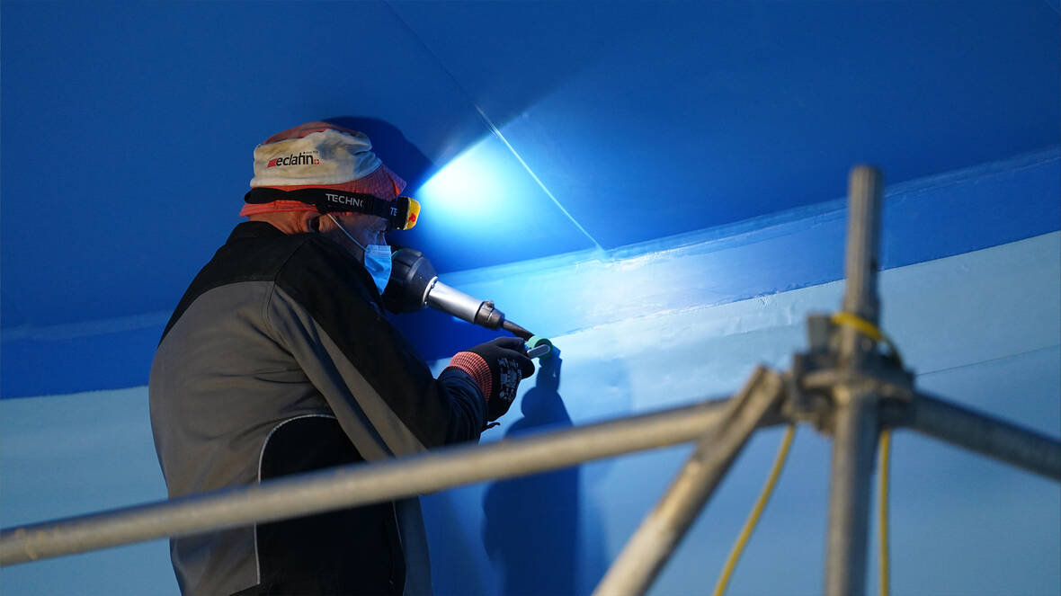 A causa dei problemi con il sottosuolo minerale l'approvvigionamento idrico di Urdorf ha dovuto trovare una soluzione. Il manto impermeabilizzante in PE idoneo per acqua potabile è perfetto per questo progetto ed è l'opzione di rivestimento ideale per il risanamento delle due camere d'acqua di forma circolare. Il sistema garantisce una separazione completa tra l'acqua potabile e il sottofondo esistente. Anche il soffitto a volta è stato rivestito con pannelli in PE. È stato un lavoro speciale anche per noi. Siamo riusciti a eseguire da un’unica fonte tutti i lavori necessari per il risanamento: le trivellazioni, le opere di demolizione e da muratore, i successivi interventi di riparazione e la rispettiva realizzazione dell’impianto e delle tubazioni.