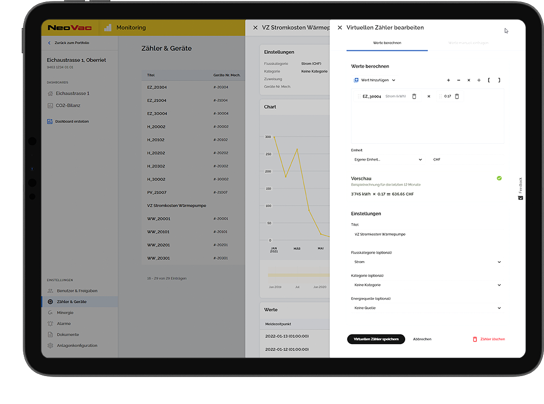 Mit der Software «NeoVac Monitoring Pro» behalten Sie den Energieverbrauch ganzer Gebäude und Areale stets im Blick – ideal für das Immobilienmanagement und Facility-Profis! Individuelle virtuelle Zähler und flexible Alarme sorgen dafür, dass Sie Sie jederzeit die vollständige Kontrolle behalten.